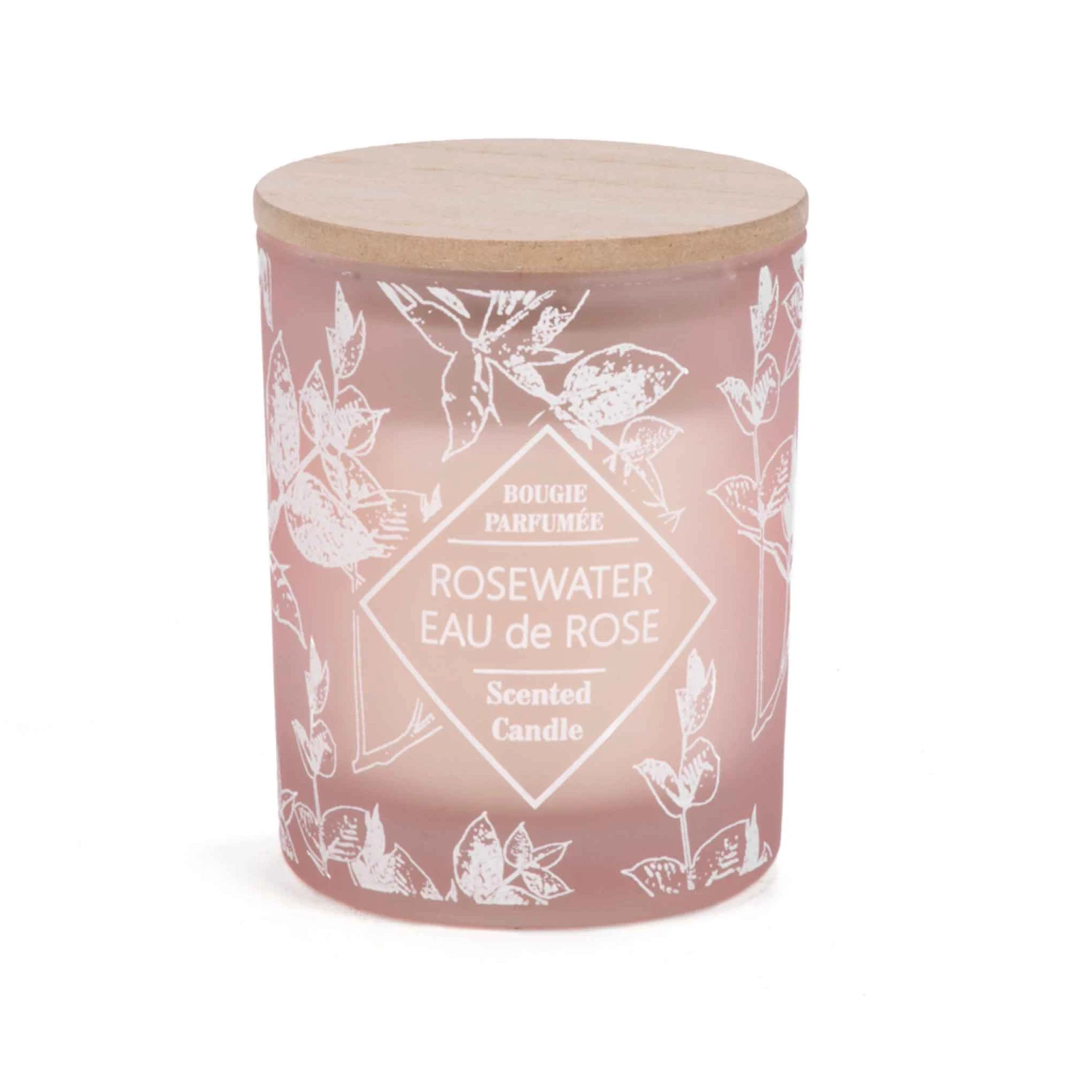 • Chandelle parfumée dans contenant en verre givré de couleur rose avec motif de feuillage et couvercle en bois naturel