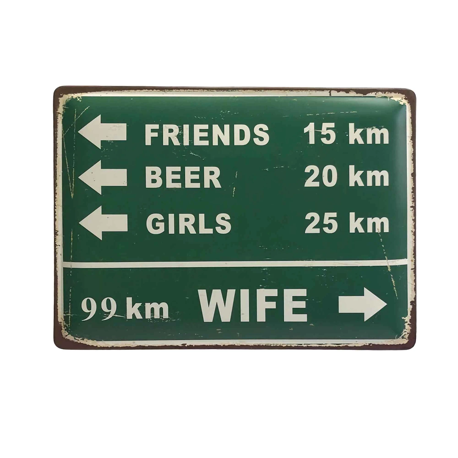 • Enseigne murale d’autoroute en étain au fini antique avec inscription anglaise : Amis 15 km, Bière 20 km, Filles 25 km et Épouse 99 km