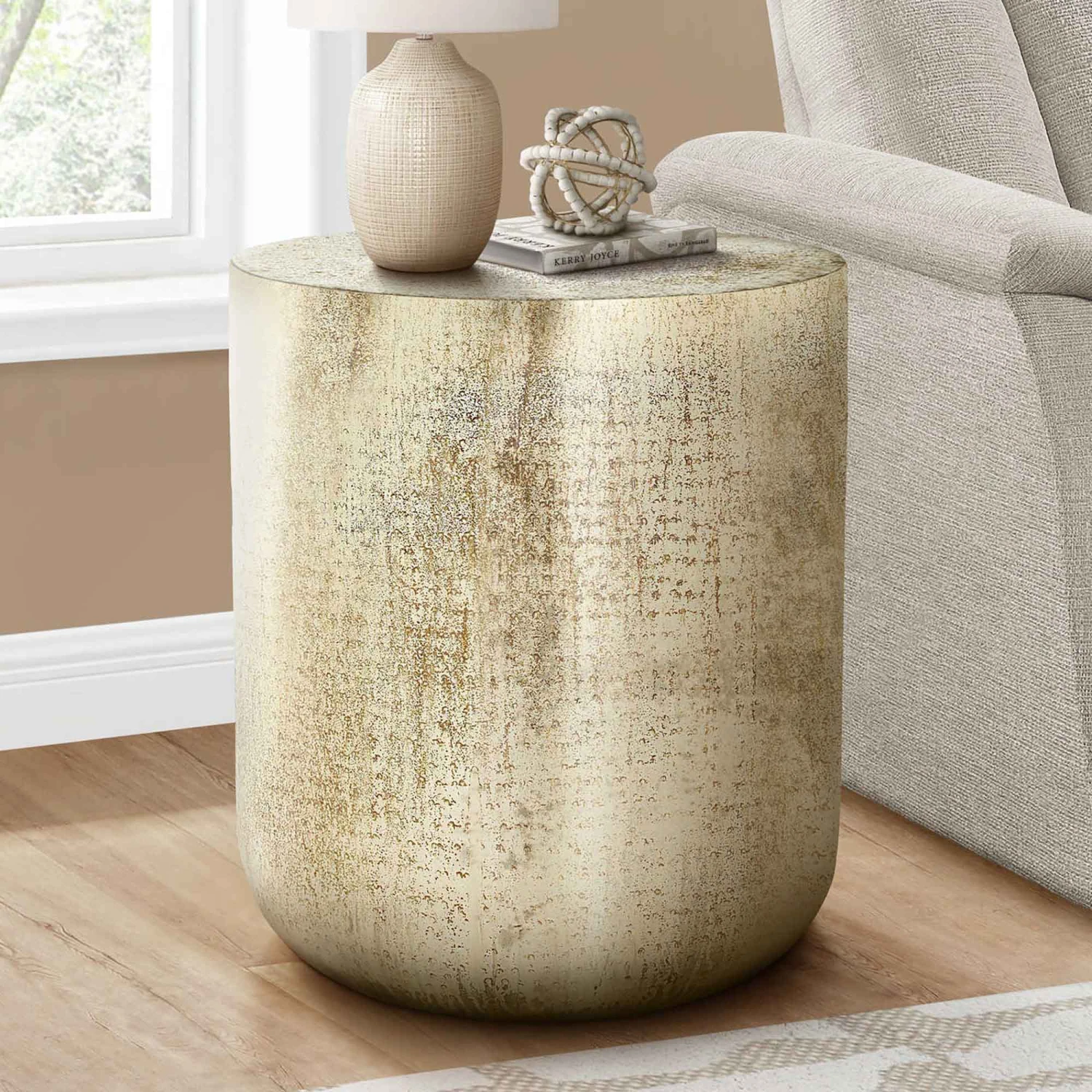 • Ajoutez du caractère et de la beauté à votre maison avec cette table d’accent de style tambour de 22” de hauteur dans une finition métallique or antique