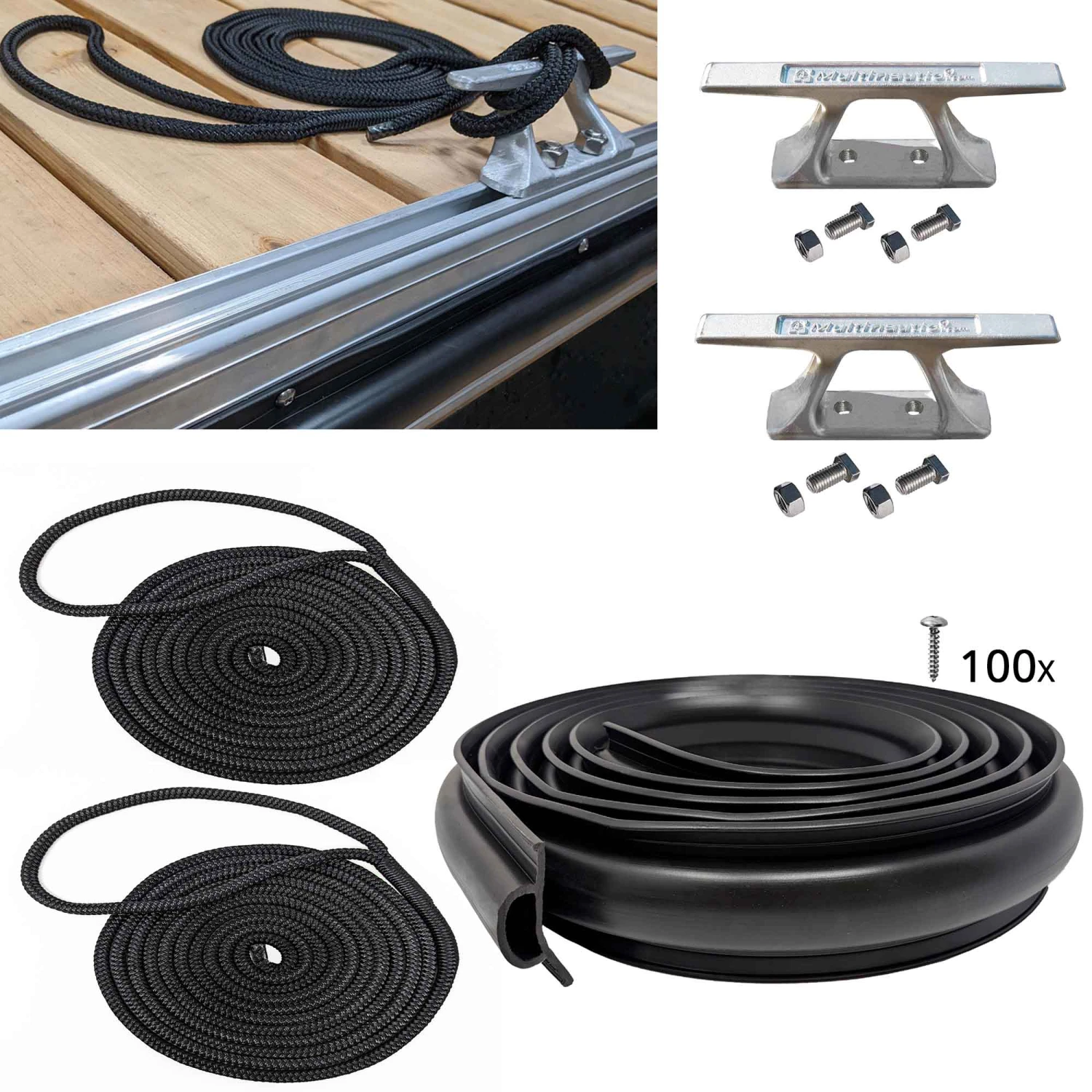 • Comprend : (1) rouleau de pare-chocs de quai noir de 16′, (100) vis en acier inoxydable à tête bombée #10 x 1″, (2) taquets de quai en aluminium de 8″, (4) boulons à tête en ”T’’ avec écrous et (2) amarres de 15′ noires